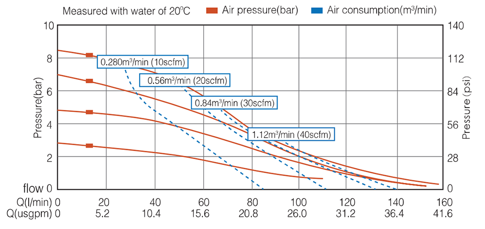 | Max. Ascenseur à aspiration La hauteur d'aspiration change avec les différentes combinaisons de matériaux de bille, de siège et de diaphragme. | Sec 4m Humide 8m |