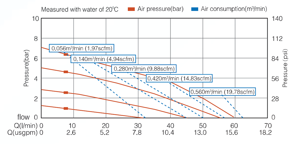 | Max. Ascenseur à aspiration La hauteur d'aspiration change avec les différentes combinaisons de matériaux de bille, de siège et de diaphragme. | Sec 4m Net 7,6 m |