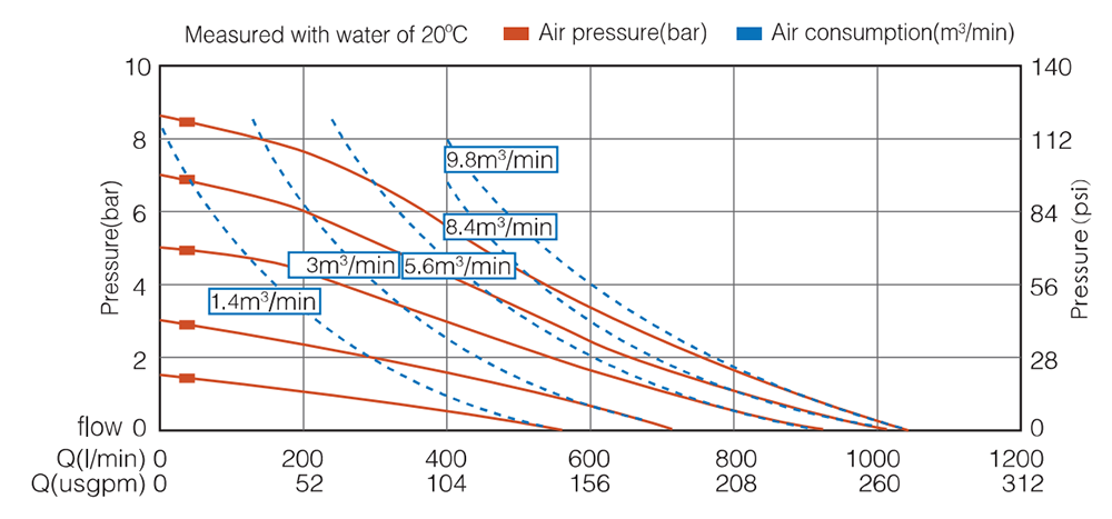 | Max. Ascenseur à aspiration La hauteur d'aspiration change avec les différentes combinaisons de matériaux de bille, de siège et de diaphragme. | Sec 5m Humide 8m |